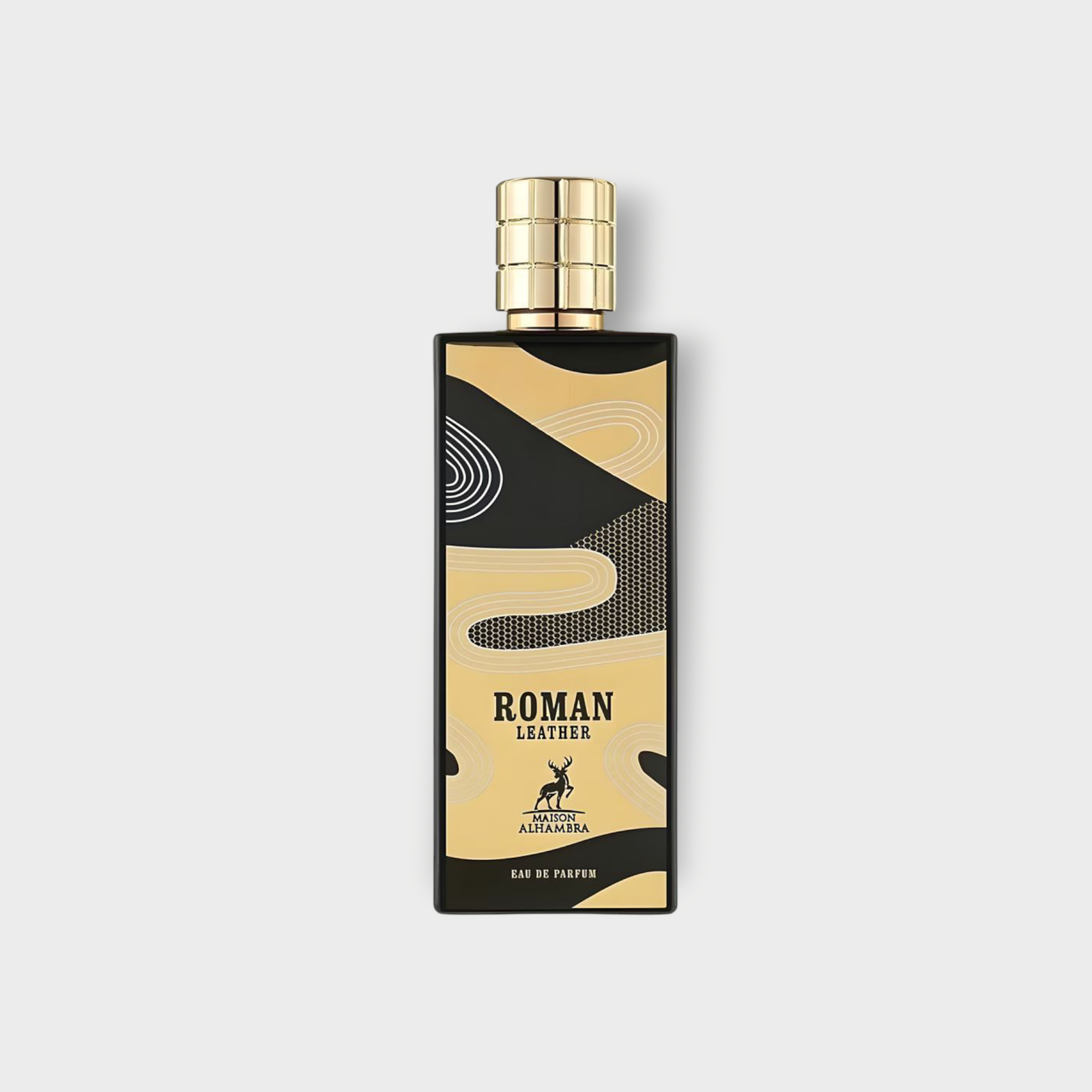 - زجاجة ذات تصميم كلاسيكي داكن يعكس قوة وفخامة الجلد.