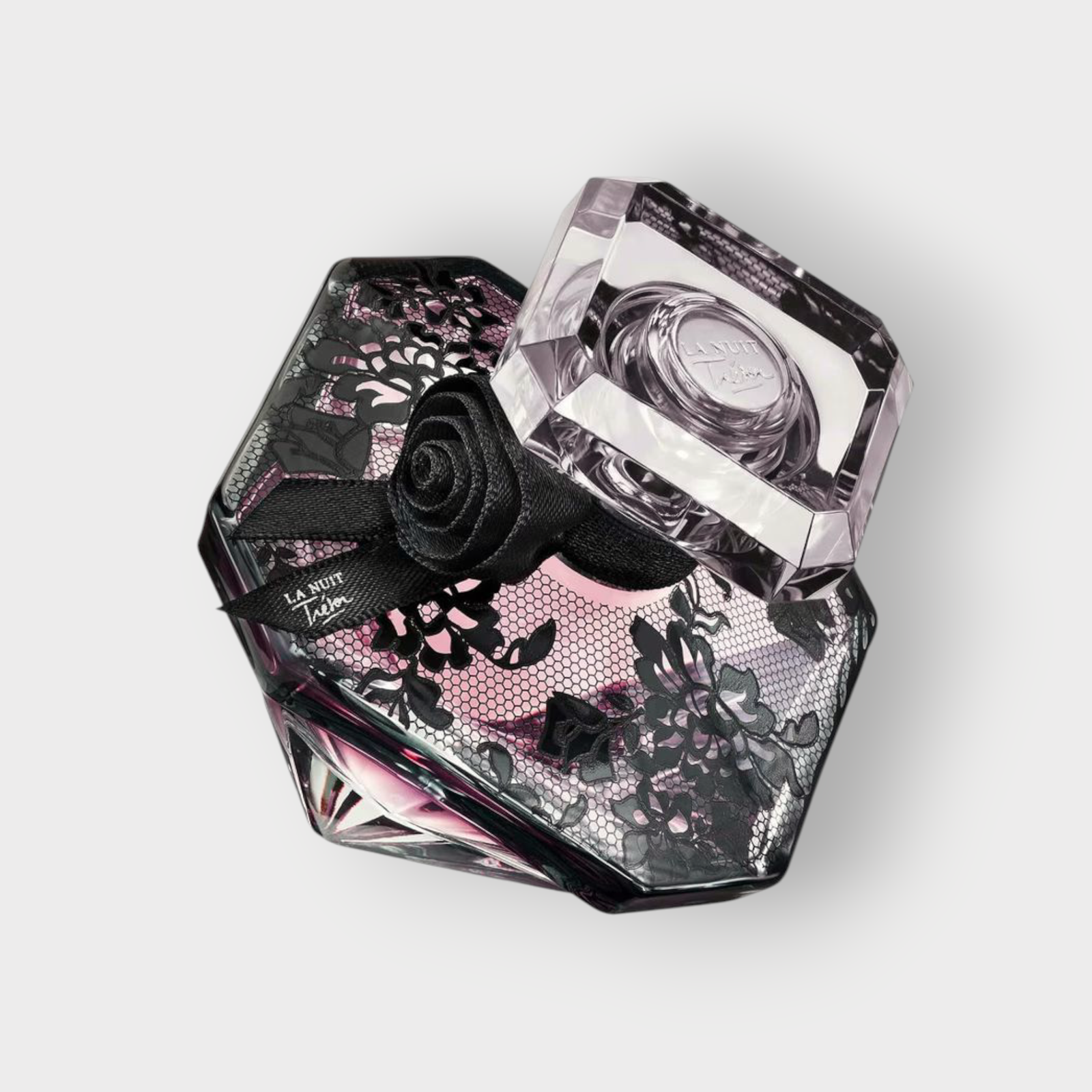 - زجاجة ماسية أيقونية مزينة بدانتيل أسود فاخر يحاكي اسم العطر.