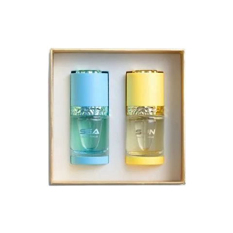 عطر مجموعة الصيف (Summer Collection) هي طقم يجمع بين عطر سي (Sea) للنساء وعطر صن (Sun) للجنسين، وكلاهما بحجم 15 مل. عطر سي مائي زهري حيوي يركز على النوتات البحرية والحمضيات. عطر صن حمضي زهري مشرق يركز على الحمضيات والأزهار البيضاء. الطقم مصمم ليقدم انتعاشاً مزدوجاً، حيث يمزج بين الروائح المائية والحمضية، مثالي للاستخدام خلال فصول الدفء أو كهدية صيفية.